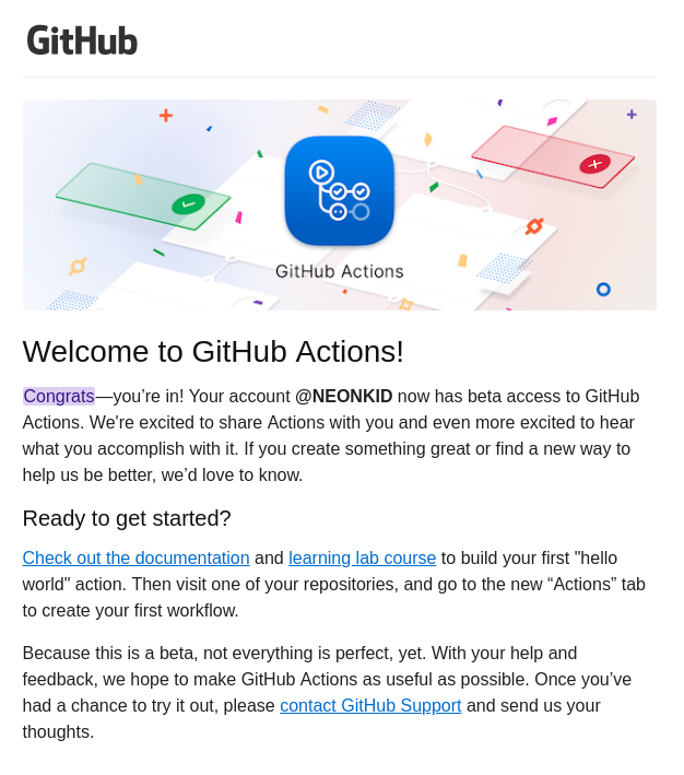 ๊ทธ๋ฆฌ๊ณ ์ผ๋ง ์ , Actions์ ์ก์ธ์ค ํ ์ ์๋ค๋ ๋ฉ์ผ์ ๋ฐ๊ฒ ๋์์ต๋๋ค. ์ ์ฒญ ์๊ธฐ์ ๋ฐ๋ผ ๋ฉ์ผ์ ๋ฐ๊ฒ ๋๋ ์์ ๊ธฐ๊ฐ์ด ๋ฌ๋ผ์ง ์ ์์ง๋ง, ์ด ๊ธฐ๋ฅ์ 2018๋ ์ ๊ณต๊ฐ๋ ๊ธฐ๋ฅ์ด๊ธฐ ๋๋ฌธ์ ์๋ง๋ ์กฐ๋ง๊ฐ(?) ์ ์ ๊ธฐ๋ฅ์ผ๋ก ํ์ฑํ ๋์ง ์์๊น ๋ผ๋ ์๊ฐ์ ์กฐ์ฌ์ค๋ ํด๋ด ๋๋ค.