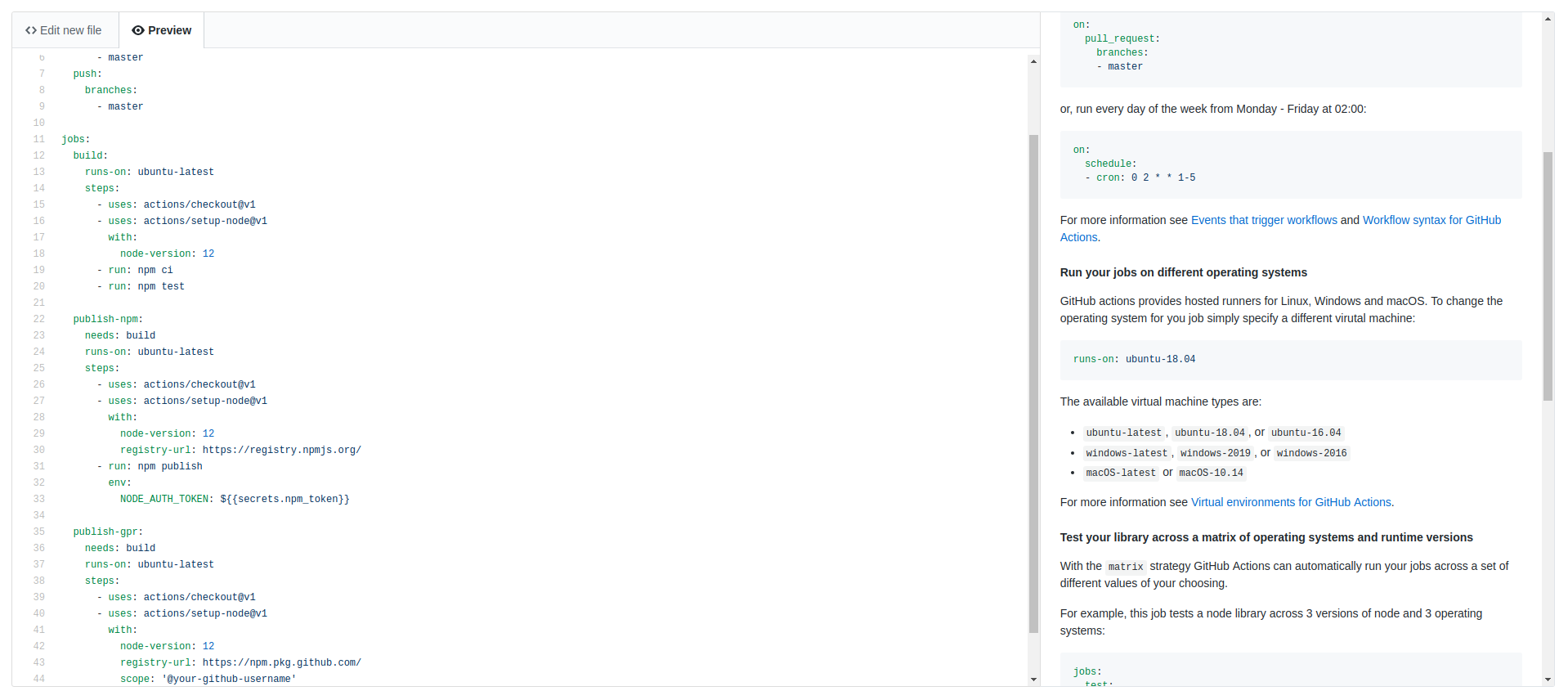 ๊ฐ๋จํ Node.js ํจํค์ง์ ๋ํ ๋ ํผ๋ฐ์ค๋ฅผ ์ดํด๋ดค์ต๋๋ค. ๋์ ๋๋ ๊ฒ์ ๋ค๋ฅธ CI์ ๋ง์ฐฌ๊ฐ์ง๋ก YAML ํฌ๋งท์ ์ฌ์ฉํ๋ค๋ ๊ฒ์ ๋๋ค. ๊ทธ๋ฆฌ๊ณ ๊ธฐ์กด์ Travis CI๋ฅผ ์ฌ์ฉํ๋ฉด์ Windows ๋น๋ ํ๊ฒฝ์ด ์ง์๋์ง ์๋๋ค๋ ๊ฒ์ด ์กฐ๊ธ์ ๋ง์์ ๊ฑธ๋ ธ์๋๋ฐ, Github Actions์์๋ Windows ๋น๋ ํ๊ฒฝ๋ ์ง์๋๋ ๊ฒ์ด ๋์ ๋๋ค์.