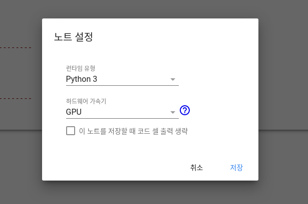 ์๋จ ์ผ์ชฝ์ ๋ณด๋ฉด ๋ฐํ์ ๋ฉ๋ด๊ฐ ์์ต๋๋ค. ๊ฑฐ๊ธฐ์์๋ ํ์ฌ ํ๊ฒฝ์ ๋ํ ๋ฐํ์์ ๋ฐ๊ฟ ์๊ฐ ์๋๋ฐ, ๊ฑฐ๊ธฐ์์ ๋ฐํ์ ์ ํ ๋ณ๊ฒฝ์ ํด๋ฆญํ๋ฉด GPU๋ฅผ ์ฌ์ฉํ ์ ์์ต๋๋ค. ๋ฌผ๋ก Colab์์๋ TPU๋ ์ง์ํ์ง๋ง ์ฌ๊ธฐ์๋ GPU๋ฅผ ์ฌ์ฉํด๋ณด๋๋ก ํ๊ฒ ์ต๋๋ค.