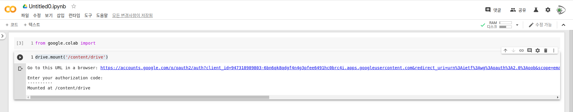 ๊ทธ๋ฐ ๋ค์, ์์ ์ ๋๋ผ์ด๋ธ๋ฅผ Colab ํ๊ฒฝ์ ๋ง์ดํธ๋ฅผ ํฉ๋๋ค. ๋ง์ดํธ ๊ฒฝ๋ก๋ '/content/drive'๋ฅผ ์ฌ์ฉํ๋๋ก ํ๊ฒ ์ต๋๋ค.