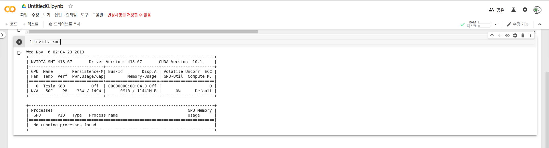 Wow, ๋ฌด๋ ค ๋ค๋ฆ ์๋ Tesla K80 1๊ฐ๋ฅผ ์ฃผ์ด์ฃผ๋ค์. ์ด๋ฐ ๊ฑธ ๋ฌด๋ฃ๋ก ์ฌ์ฉํด๋ณผ ์๊ฐ ์๋ค๋... ์์ฒญ ์ข๋ค์. ํ์ง๋ง ์ฌ๊ธฐ์๋ ์ฝ๊ฐ์ ์ ์ฝ์ ์กด์ฌํฉ๋๋ค.