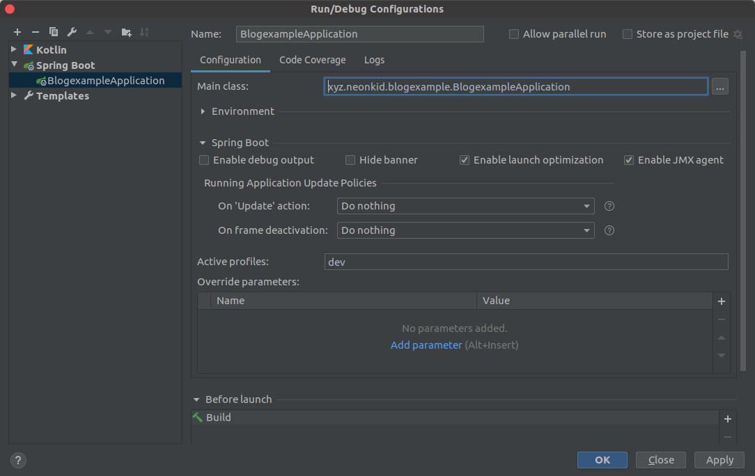 ๊ทธ๋ฐ ๋ค์, ์ ์ ํ ์ด๋ฆ์ ์ ๋ ฅํ๊ณ , Main class์ Spring boot Main Application ํด๋์ค๋ฅผ ๋ฃ์ด์ค ๋ค์, Active Profiles์ ์ํ๋ ํ๊ฒฝ ์ค์ ํ์ผ์ ์ ๋ ฅํด์ฃผ๋ฉด ๋ฉ๋๋ค.