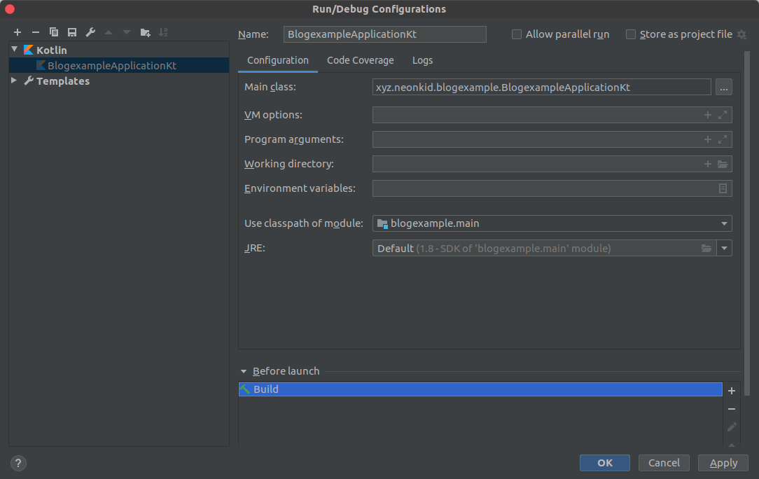 ์ฒ์์๋ ์ฝํ๋ฆฐ ์คํ ํ๊ฒฝ๋ง ์ ๊ณตํ๊ธฐ ๋๋ฌธ์ ๋ณ๋๋ก Spring boot์ ํ๊ฒฝ ์ค์ ์ ๋ง๋ค์ด์ค์ผ ํฉ๋๋ค. Templates ๋ฒํผ์ ํด๋ฆญํ์ฌ Spring boot Configuration์ ์ถ๊ฐํด์ค๋๋ค.