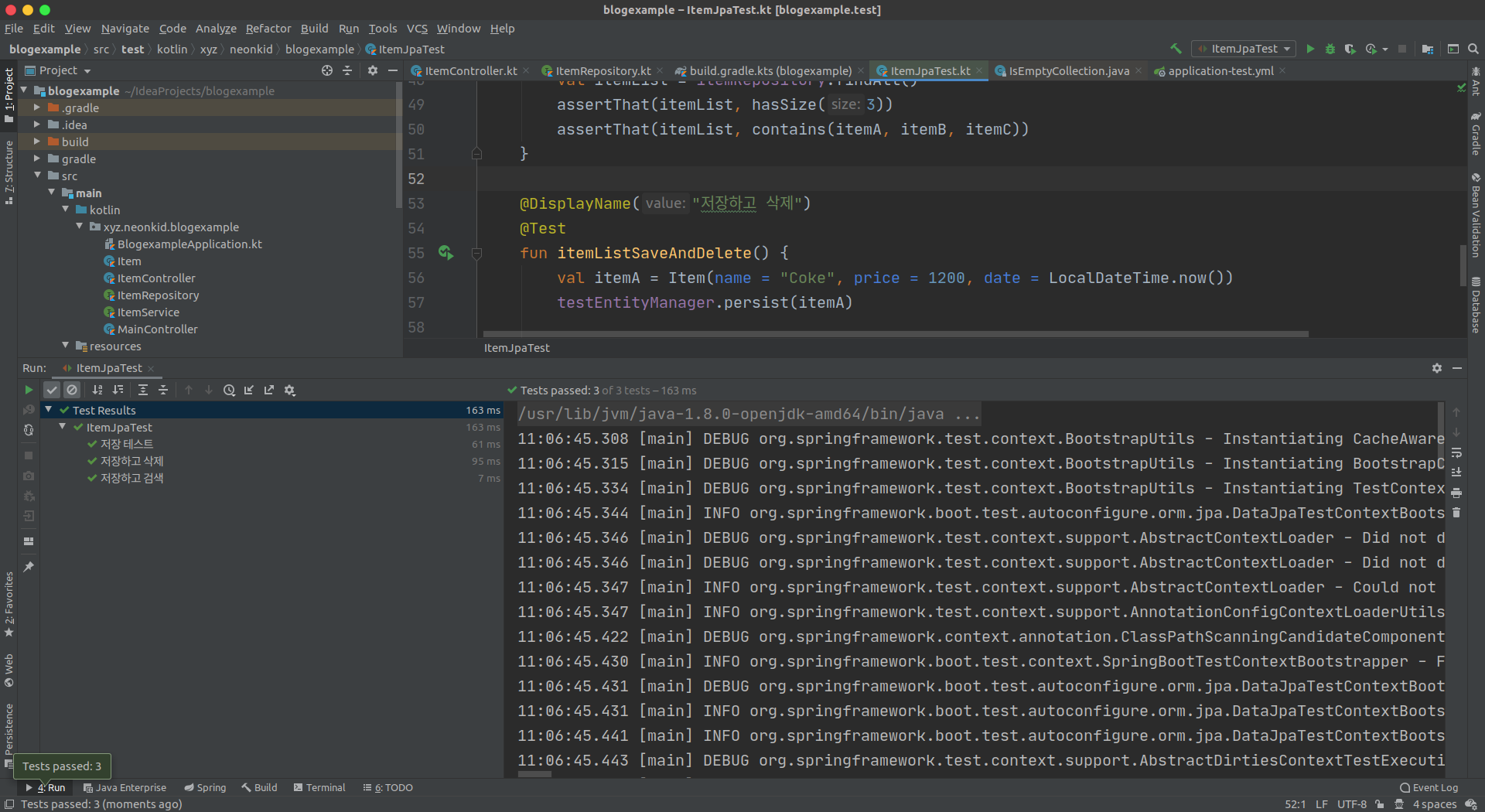 ์ด๋ฒ์๋ ์์ฑ์ ์ฃผ์ ๋ฐฉ์์ผ๋ก EntityManager์ Repository๋ฅผ ์ฃผ์ ํ์๊ณ , ํ ์คํธ ์ฝ๋๋ ์ด 3๊ฐ๋ก ๊ตฌ๋ถํ์์ต๋๋ค. Item์ด๋ผ๋ ๋๋ค์ ์ํ์ ์์ฑํ๊ณ , testEntityManager์ persist ๋ฉ์๋๋ฅผ ์ด์ฉํ๋ฉด ์ ์ ๋์ํ๋์ง๋ฅผ ํ ์คํธํ ์ ์์ต๋๋ค.