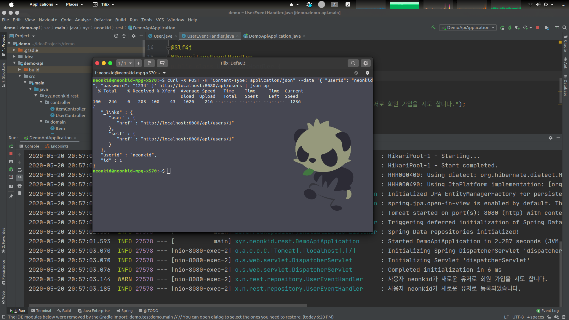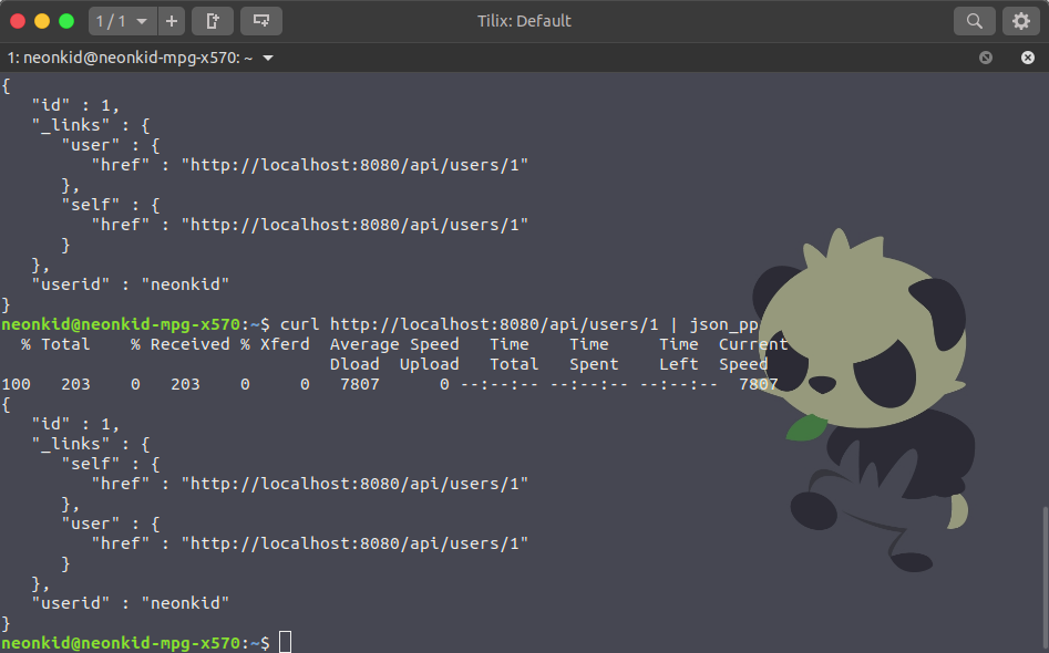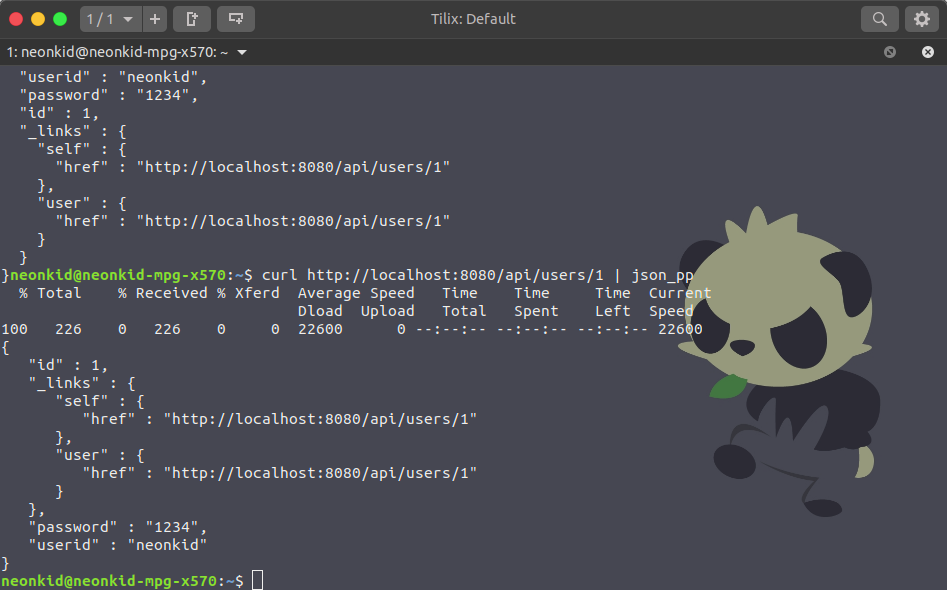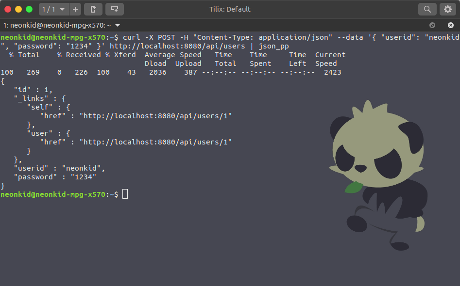 $ curl -X POST -H "Content-Type: application/json" --data '{ "userid": "neonkid", "password": "1234" }' http://localhost:8080/api/users | json_pp