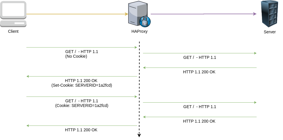 HAProxy์ ํ๋ฆ์ ์์ ๊ฐ์ด ์ด๋ฃจ์ด์ง๋๋ค. ์ต์ด ์ ๊ทผ์์๋ ์ผ๋ฐ์ ์ธ HTTP ์์ฒญ์ผ๋ก ์ ๋ฌํ๋ค๊ฐ, HAProxy๊ฐ ์๋ก์ด ์ฌ์ฉ์์์ ์ธ์ํ๊ณ , ์ด ์ฌ์ฉ์๊ฐ ์ฐ๊ฒฐํ ์ ์ฉ ์ธ์คํด์ค๋ฅผ ์ฟ ํค ์ด๋ฆ์ผ๋ก ์ ๋ฌํด์ฃผ๊ณ , ์ฌ์์ฒญ์ ํด๋ผ์ด์ธํธ๊ฐ ์ฃผ์ด์ฃผ๋ ์ฟ ํค๋ฅผ ๊ฐ์ง๊ณ ์ฒ์ ์ฐ๊ฒฐํ๋ ์ธ์คํด์ค๋ก ์ฐ๊ฒฐํด์ฃผ๋ ๋ฐฉ์์ ๋๋ค.