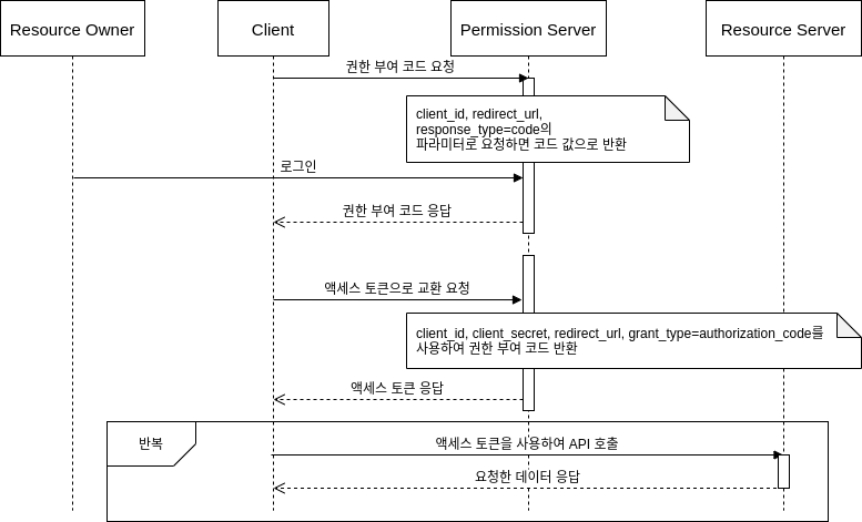 ์ ์์ ์ผ๋ก ์์ ๋ฏธ๋์ด์์ ํด๋ผ์ด์ธํธ ์ธ์ฆ์ด ํ์ธ๋์๋ค๋ฉด, ๊ถํ ๋ถ์ฌ ์ฝ๋๋ฅผ ํด๋ผ์ด์ธํธ์๊ฒ ๋ณด๋ ๋๋ค. (์ด ๋, ๊ถํ ๋ถ์ฌ ์ฝ๋๊ฐ code์ด๋ฉด, ๊ถํ ๋ถ์ฌ ์ฝ๋ ์น์ธ ํ์ , token์ด๋ฉด ์์์ ์น์ธ ํ์ ) ํด๋ผ์ด์ธํธ๋ ์ด ์ฝ๋๋ฅผ ์ฌ์ฉํ์ฌ, ๋ง์ง๋ง์ผ๋ก ์ก์ธ์ค ํ ํฐ์ ๊ถํ ์๋ฒ์ ์ถ๊ฐ๋ก ์์ฒญํฉ๋๋ค. ์ด ๋ ํ์ํ ํ๋ผ๋ฏธํฐ๋ Client ID, Client Secret, Redirect URI, ์ธ์ฆ ํ์ ์ ๋๋ค.