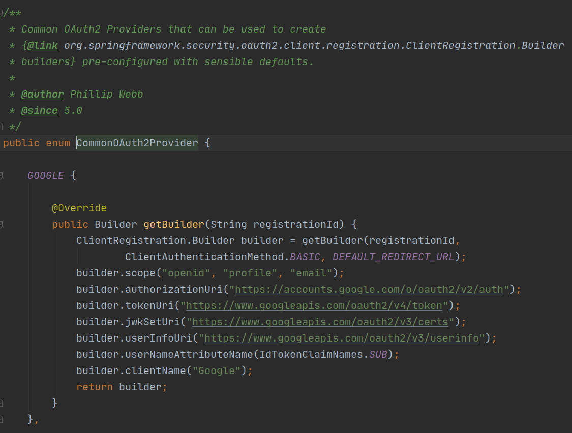 ClientRegistration ํด๋์ค๋ Spring boot Security์์ ์ ๊ณตํ๋ OAuth2 Client ํด๋์ค์ ๋๋ค. ์ฐ๋ฆฌ๊ฐ ์ง๋ ํฌ์คํธ์์ ์ฌ์ฉํ๋ Google OAuth2 ์ธ์ฆ ๊ตฌํ ์ญ์ ์ด ํด๋์ค๋ก ๊ตฌํ๋ Google OAuth2 Provider๋ฅผ ์ฌ์ฉํ ๊ฒ์ ๋๋ค.