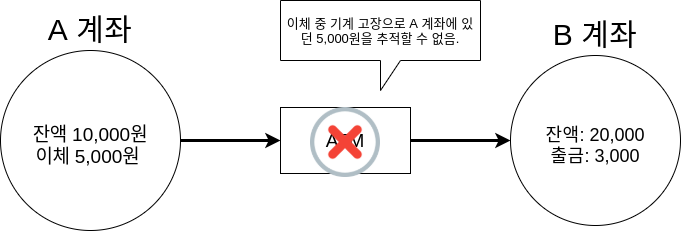 κ·Έλ¦ΌμΌλ‘ μ½κ² μ€λͺ ν΄λ³΄μλ©΄, A κ³μ’μμλ 5,000μμ΄ μ΄μ²΄ λμλ€λ κΈ°λ‘μ΄ μμ§λ§ μ€κ°μ κΈ°κ³μμ μ€λ₯κ° λ°μνλ©΄μ B κ³μ’μλ κ·Έ κΈ°λ‘μ΄ λ¨μ§ μμΌλ―λ‘ A κ³μ’μ μλ 5,000μμ μ 보λ₯Ό μ μ° μμ€ν μμ μ°Ύμ μ μκΈ° λλ¬Έμ λ¬Έμ κ° λ©λλ€.