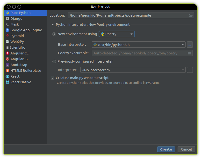๊ทธ๋ฌ๋ฉด New environment using ๋ฉ๋ด์ Poetry๋ผ๋ ๋ฉ๋ด๊ฐ ์๊ธฐ๊ฒ ๋ฉ๋๋ค. PyCharm์์ ์๋์ผ๋ก Poetry ๋ช ๋ น์ด์ ์์น๋ฅผ ์ฐพ๊ธฐ ๋๋ฌธ์ ๋ช ๋ น์ด ์์น๋ ๋ณ๋๋ก ์ค์ ํ์ง ์๊ณ , main.py ์คํฌ๋ฆฝํธ๋ฅผ ์์ฑํ๋ ์ต์ ์ ์ฒดํฌ๋ฅผ ๋๋ฅธ ํ ํ๋ก์ ํธ ์์ฑ์ ์งํํด๋ด ์๋ค.