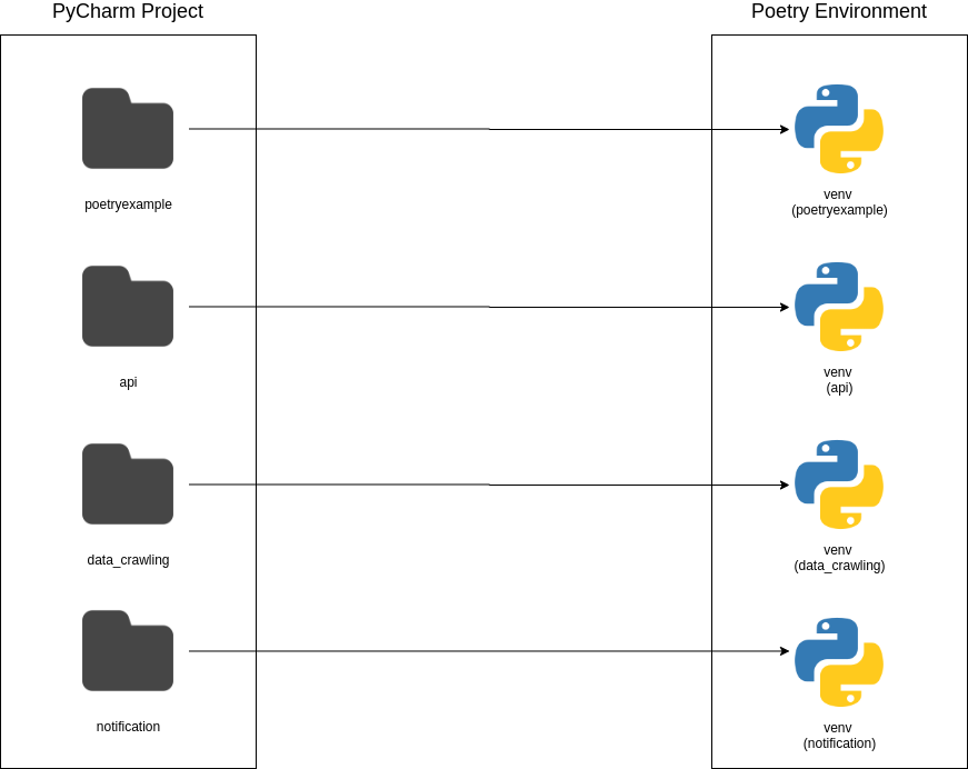 Poetry๋ฅผ ๊ณ์ ์ด์ฉํ๋ฉด์ ์ด๋ฌํ ์๋ฌธ์ ์ด ๋ค ๊ฒ์ ๋๋ค. ๊ธฐ์กด์ PyCharm์์ requirements๋ฅผ ์ฌ์ฉํ ๋๋ Virtualenv๋ฅผ ์ฌ์ฉํ์ฌ ํ๋ก์ ํธ๋ง๋ค ๋ค๋ฅด๊ฒ ๋ํ๋์๋ฅผ ์ฃผ๊ธฐ ์ํด ํ๊ฒฝ์ ๋๋์๊ณ , ์ด ํ๊ฒฝ์ ํ๋ก์ ํธ ์์ ํด๋์ venv ํด๋๋ก ์ ๊ณต๋ฉ๋๋ค.