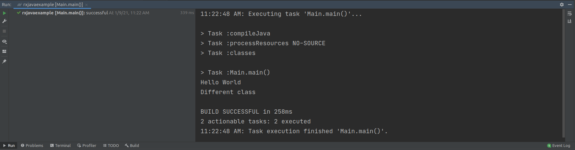Observable.just("Hello World", "Different class").subscribe(System.out::println);