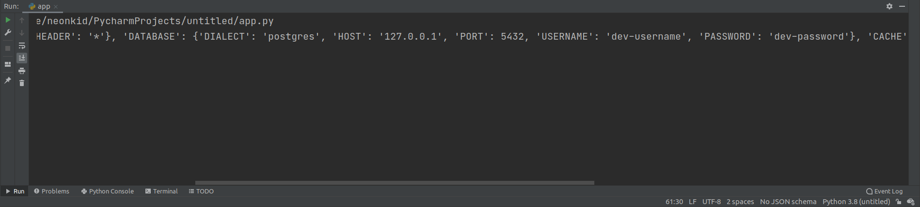 ๊ธฐ๋ณธ์ ์ผ๋ก ํ๊ฒฝ ๋ณ์๊ฐ ์ค์ ๋์ด ์์ง ์์ ๊ฒฝ์ฐ 'dev'๋ก ๋ถ๋ฌ์ค๋๋ก ์ค์ ๋์๊ธฐ ๋๋ฌธ์ dev ํ๊ฒฝ์ ์ค์ ๊ฐ์ด ์ถ๋ ฅ๋๊ณ ์์์ ํ์ธํ ์ ์์ต๋๋ค.