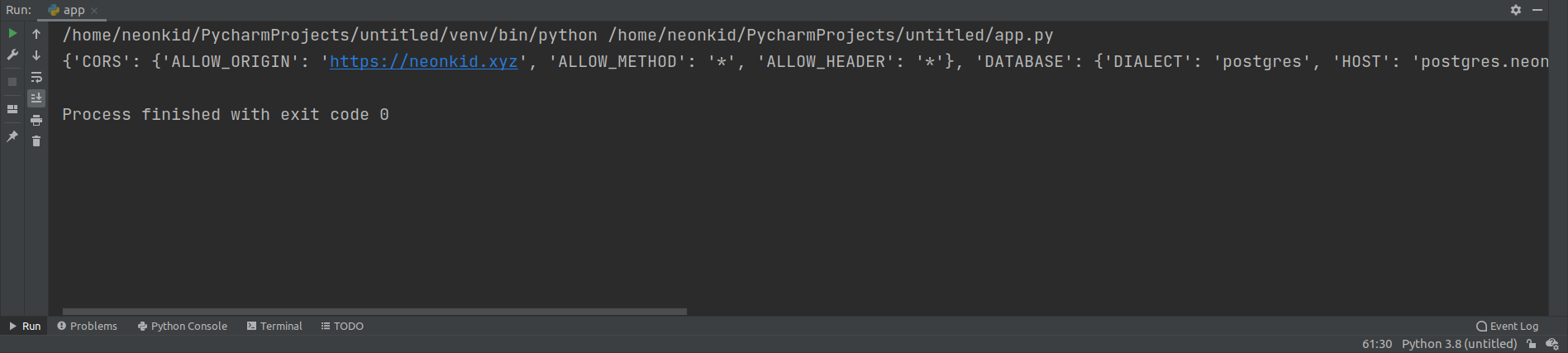 Python์์ ์ ๊ณตํ๋ os ์ฝ๋๋ฅผ ์ฌ์ฉํ์ฌ ํ๊ฒฝ ๋ณ์์ ์ ๊ทผํ๋ ํจ์๋ฅผ ์ด์ฉํด๋ณด๋๋ก ํ๊ฒ ์ต๋๋ค. OS ํ๊ฒฝ ๋ณ์์์ APP_ENV์ prod, dev, test๋ฅผ ๋ถ์ฌ์ฃผ๋ ๊ฒ์ผ๋ก ํ์ฌ๊ธ ํ๊ฒฝ์ ๋ค๋ฅด๊ฒ ์คํํ๋ ๊ฒ์ผ๋ก ๊ตฌํํด์ค๋๋ค.