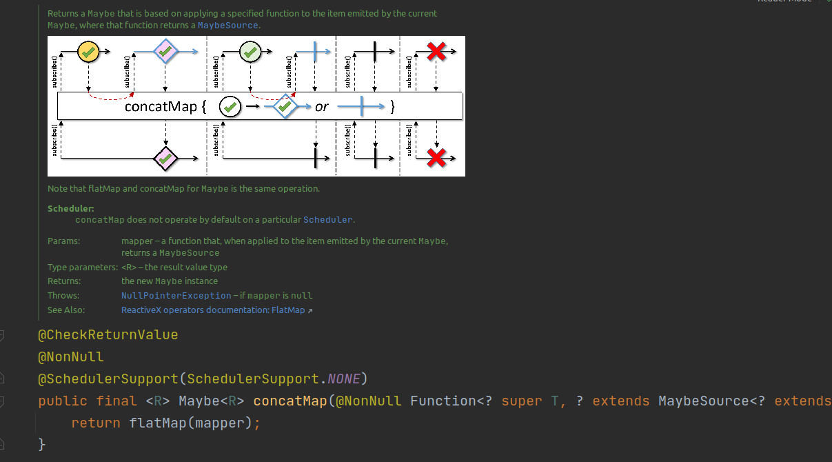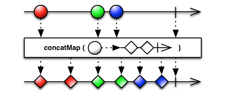 ๊ทธ๋ฐ๋ฐ, map์ flatMap ๋ฑ ์ฌ๋ฌ ํ์๋ ํํ๊ฐ ๋ง์๋ฐ,๊ทธ ์ค์์๋ flatMap์ Java 8์ Stream์์๋ ์์ฃผ ๋ณด์ด๋ ๊ฒ์ผ๋ก, RxJava์ ์๋ flatMap๊ณผ ๋์ผํฉ๋๋ค. ์ด์ ๋น์ทํ๊ฒ RxJava์์๋ concatMap์ด๋ผ๋ ๋ฉ์๋๊ฐ ์์ต๋๋ค.