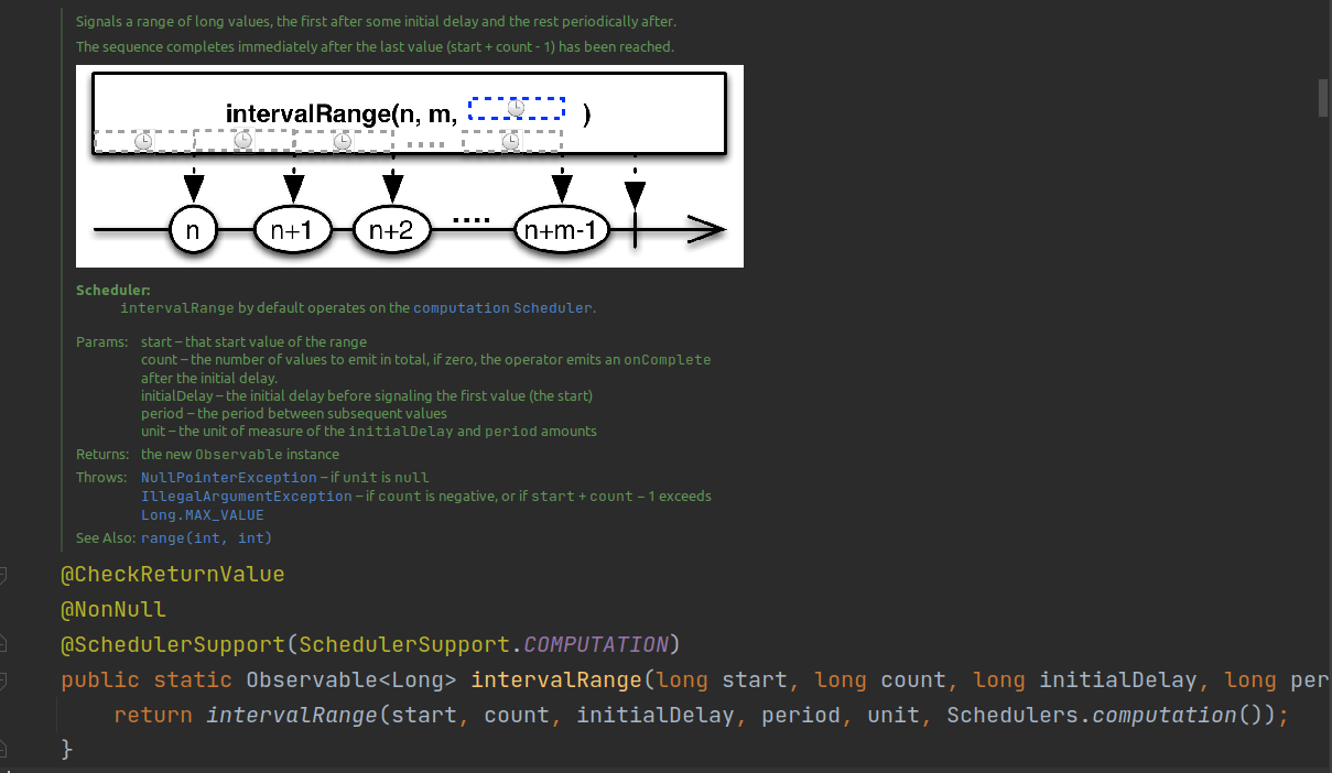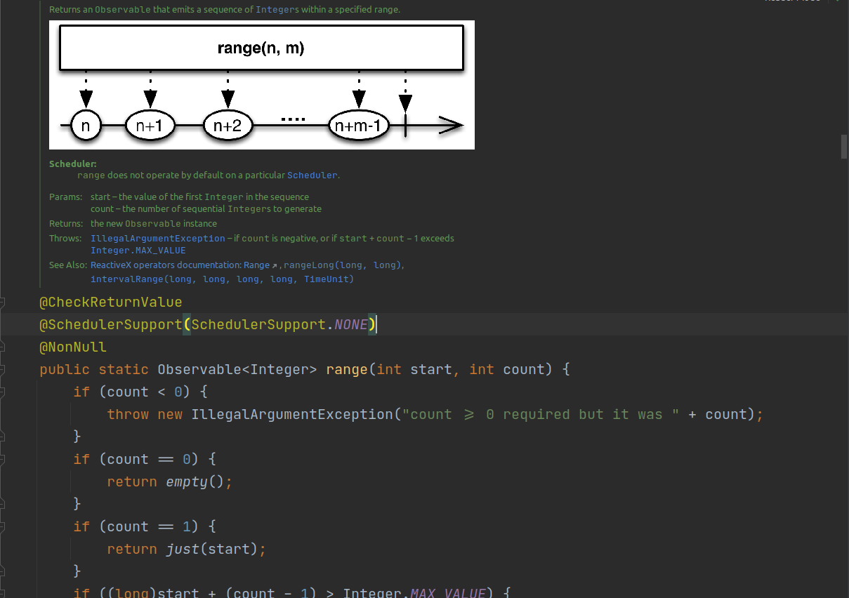 range ์ฐ์ฐ์๋ ์ฃผ์ด์ง ๊ฐ n ๋ถํฐ m ๊น์ง์ ๋ฐ์ดํฐ๋ฅผ ๋ฐํํด์ฃผ๋ ๋ฒ์ ์ฐ์ฐ์์ ๋๋ค. ๊ฐ๋ น interval์ด๋ timer์์๋ Long ํด๋์ค๋ฅผ ์ฌ์ฉํ๋ค๋ฉด range๋ Integer ํด๋์ค๋ฅผ ์ฌ์ฉํ์ฌ ๋ฒ์๋ฅผ ์ฃผ์ด์ค๋๋ค.