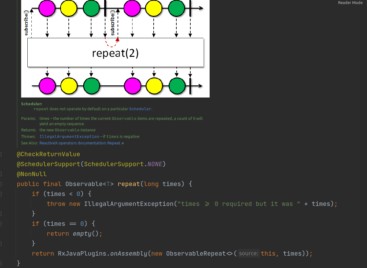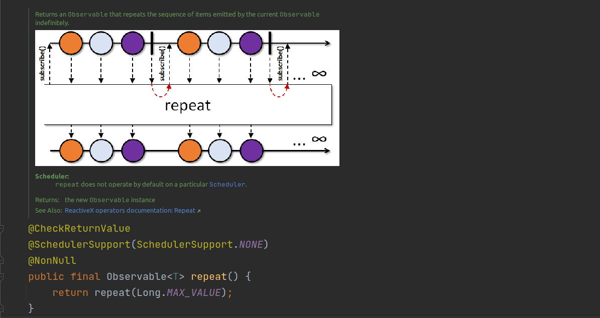 ๊ธฐ๋ณธ์ ์ผ๋ก repeat ๋ฉ์๋๋ repeat(2) ๋ฉ์๋๋ฅผ ํธ์ถํ์ฌ ๋์ํฉ๋๋ค. ๋ฐ๋ผ์ ๋ฐ๋ณต ํ์๋ฅผ ์ธ์๋ก ์ ํ ์๋ ์๋๋ฐ, ์ผ๋ฐ์ ์ผ๋ก ์ด๋ฅผ ์ง์ ํ์ง ์์ผ๋ฉด Long์ ์ต๋๊ฐ๊น์ง๋ฅผ ํธ์ถํ๊ฒ ๋ฉ๋๋ค.