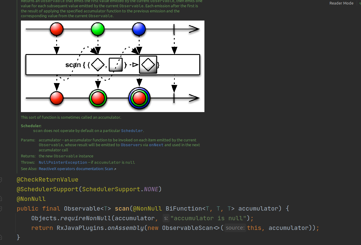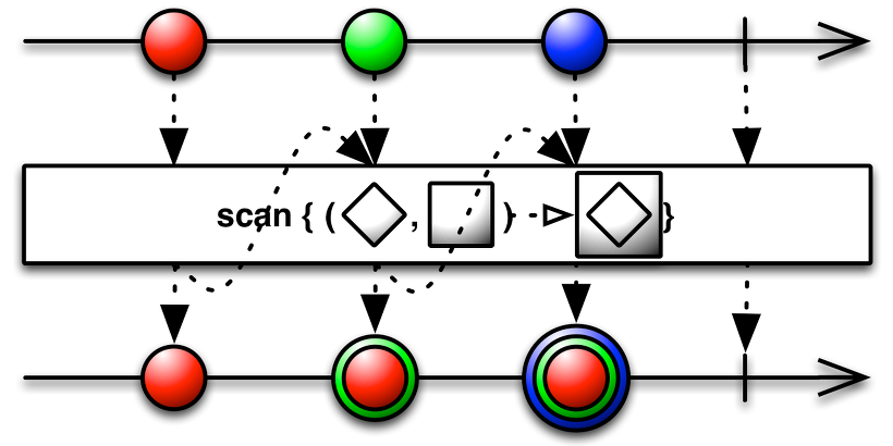 reduce์ ๋ ๋ค๋ฅธ ์ฐจ์ด์ ์ด ์๋ค๋ฉด ์ฝ๋๋ฅผ ๋ณด๋ค์ํผ Maybe ํ์ ์ ๋ฐํํ์ง ์๊ณ , Observable ํ์ ์ ๋ฐํํ๋ค๋ ์ ์ ๋๋ค. reduce์ ๊ฒฝ์ฐ ๋ง์ง๋ง ๋ฐ์ดํฐ๊ฐ NULL์ด๊ฑฐ๋ ๊ฐ์ด ์์ ๊ฒฝ์ฐ ํน์ onComplete ์ด๋ฒคํธ๊ฐ ๋ฐ์ํ์ง ์์ผ๋ฉด ๊ตฌ๋ ์์๊ฒ ๊ฐ์ ์ ๋ฌํ์ง ์๋ NULL-safety ์ฒ๋ฆฌ๊ฐ ํฌํจ๋์ด ์๋ ๋ฐ๋ฉด, scan์ ๊ฐ์ด ์ ๋ ฅ๋ ๋๋ง๋ค ๊ทธ ๊ฒฐ๊ณผ๋ฅผ ๋ฐํํด ์ค๊ฐ์์ ๊ฒฐ๊ณผ๊น์ง๋ฅผ ๋ณด์ฌ์ฃผ๋ ๋ฉ์๋์ด๊ธฐ ๋๋ฌธ์ NULL ์ฒ๋ฆฌ๋ฅผ ํ์๋ก ํ์ง ์์ฃ .