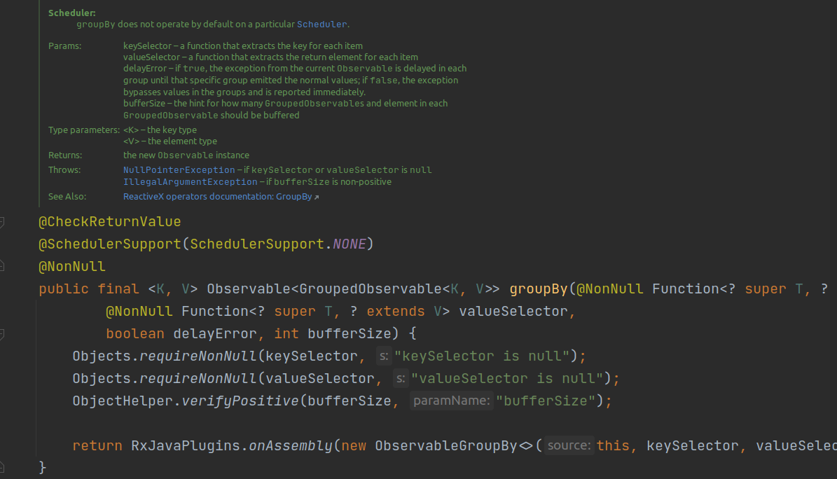 ์ฝ๋๋ฅผ ๋ณด๋ค์ํผ ๋ฐํ ํ์ ์ด GroupedObservable์ด๋ผ๋ ์ด๋ฆ์ ๊ฐ์ง๊ณ ์๊ณ , ์ด๋ Map๊ณผ ์ ์ฌํ๊ฒ Key, Value๋ผ๋ ์ ๋ค๋ฆญ์ ๊ฐ์ง๊ณ ์์ต๋๋ค. keyselector๋ฅผ ์ด์ฉํ์ฌ ํด๋น Key๋ฅผ ๊ธฐ์ค์ผ๋ก ์ฌ๋ฌ ๊ฐ์ value๋ฅผ ๋ฐํํ๋ ์ฐ์ฐ์์ ๋๋ค.