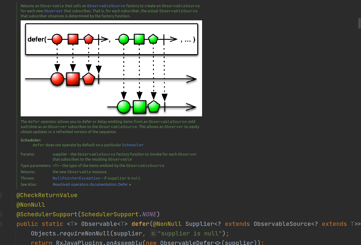 ์คํ๋ ค ์ฅ์ ์ผ๋ก ๋ณธ๋ค๋ฉด create์ just์ ๊ฒฝ์ฐ onNext, onCompleted, onError ๋ฑ๊ณผ ๊ฐ์ ์ด๋ฒคํธ ํธ์ถ์ ์ ์ํ์ฌ์ผ ํ๋๋ฐ, ๋ง์ฝ ์ด๋ค์ ์ฝ๋ฐฑ์ด ํ์๊ฐ ์๋ค๋ฉด ์คํ๋ ค defer ๋ฉ์๋๊ฐ ๋ ๋์ ํจ๊ณผ๋ฅผ ๋ณด์ผ ์๋ ์์ต๋๋ค.