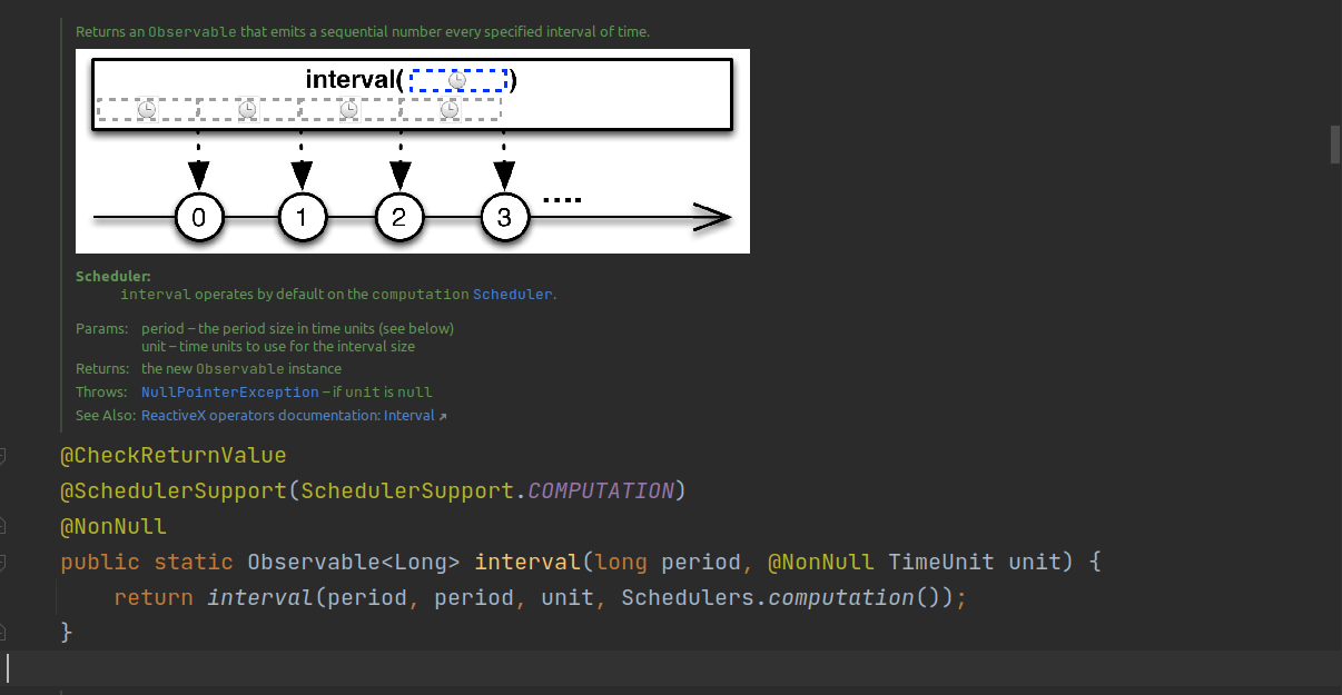 | interval(long period, TimeUnit unit) | ์ผ์ ์๊ฐ(period) ์ง์ฐ๋์๋ค ๋ฐ์ํฐ ๋ฐํ |