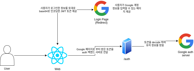 ์ฌ์ฉ์๊ฐ ์น ํ์ด์ง์ ์ ์ํด์ Google ๋ก๊ทธ์ธ์ ์์ฒญํ ๊ฒฝ์ฐ ์์์ ์ ๋ ฅํ Redirect URI๋ก ์์ฒญ์ํ๊ฒ ๋๋ฉฐ Google์์๋ ๋ก๊ทธ์ธ ํ์ด์ง๋ฅผ ๋ณด์ฌ์ฃผ๊ฒ ๋๊ณ , ์ฌ์ฉ์๊ฐ ์ ๋ณด๋ฅผ ์ ๋ ฅํ๋ฉด ์ด๋ฅผ Google์์๋ ์ธ์ฝ๋ฉ๋ JWT ํ ํฐ์ ์น์ ์ ๋ฌํ๋ฉฐ ์น์์๋ ๋ค์ ์ด๋ฅผ ๋ฐฑ์๋๋ก ์ ์กํ์ฌ ๋ฐฑ์๋๊ฐ ์ด ์ ์ ๋ฅผ ํ๋จํ ์ ์๋๋ก ํ๋ ๊ตฌ์กฐ์ ๋๋ค.