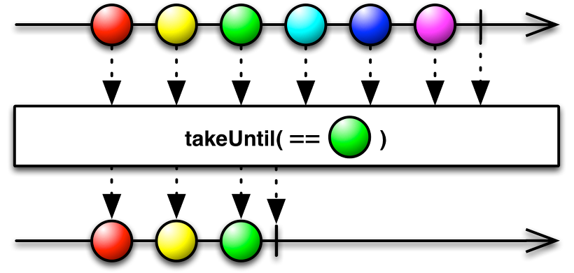 ํํฐ ์ฐ์ฐ์์ take์ ์ฐจ์ด์ ์ด ์๋ค๋ฉด take๋ ํน์ ๊ฐฏ์๋ง ๊ฐ์ ๋ฐํํ๋, ์์ ์๋ฃ ๊ธฐ์ค์ ๋ค๋ฅธ Observable ๊ฐ์ ๋ฐํ์ผ๋ก ํ๊ฒ ๋ค๋ ๊ฒ์ด์ฃ . ์ฆ ํน์ Observable ๊ฐ์ฒด์ ๊ฐ์ด ๋ค์ด์ค๋ฉด ๋ค๋ฅธ ๋ฐ์ดํฐ์ ๋ฐํ์ด ์๋ฃ๋์ง ์์๋ ๋ฐ๋ก ์๋ฃ ์ด๋ฒคํธ๋ฅผ ๋ํ๋ด๋ ๊ฒ์ ๋๋ค.