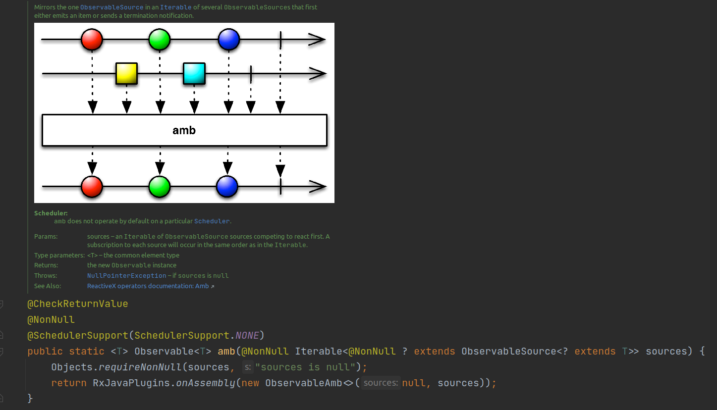 ๋น์ทํ ์ฐ์ฐ์๋ก ambWith ์ฐ์ฐ์๊ฐ ์์ต๋๋ค. ๋ณด์๋ค์ํผ ๊ธฐ์กด์ Observable ๊ฐ์ฒด์์ ์ฌ์ฉํ ์ ์๋ ์ฐ์ฐ์์ด๊ณ , amb ์ฐ์ฐ์์ ๋ค๋ฅด๊ฒ Iterable์ด ์๋ ์ผ๋ฐ Observable ๋ฐ์ดํฐ๋ฅผ ์ธ์๋ก ๋ฐ๊ณ ์์ต๋๋ค.