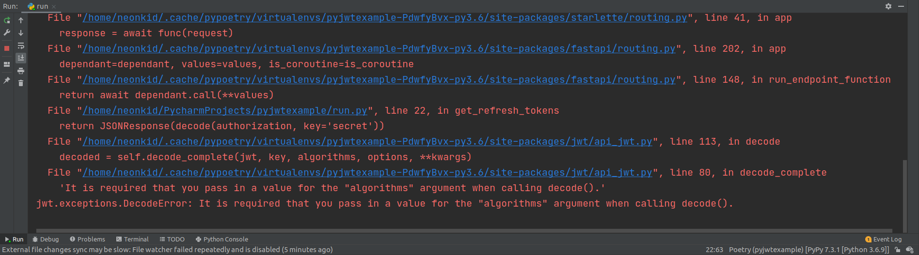 ์ด ์ค๋ฅ๋ algorithms ํ๋ผ๋ฏธํฐ๋ฅผ ๋ฐ๋์ ์ถ๊ฐํ๋ผ๋ ๋ด์ฉ์ธ๋ฐ์. PyJWT 1.7.1 ๋ฒ์ ์ ์ฌ์ฉํ๋ค๋ฉด ์๋์ ์ฝ๋๋ฅผ ์ด์ฉํ์ฌ ์ด ๊ณผ์ ์ ๋ฌด์ํ ์๋ ์์ต๋๋ค.