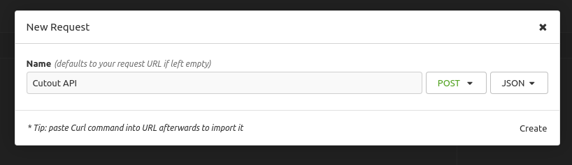 ์ด๋ฆ์ ์ง์ ํ๊ณ ๋ฉ์๋๋ฅผ GET -> POST๋ก ๋ณ๊ฒฝํ๊ณ No body -> JSON์ผ๋ก ๋ณ๊ฒฝํ ๋ค์ Create ๋ฒํผ์ ํด๋ฆญํฉ๋๋ค.