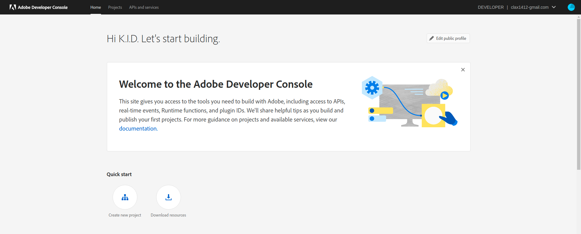 Adobe I/O ํํ์ด์ง์์ ๋ก๊ทธ์ธ์ ์งํํฉ๋๋ค. ๊ทธ๋ฐ ๋ค์ ์ฝ์๋ก ๋ค์ด๊ฐ๋ฉด ์ ํ๋ก์ ํธ๋ฅผ ๋ง๋ค ์ ์๋ ๋ถ๋ถ์ด ๋ํ๋ฉ๋๋ค.