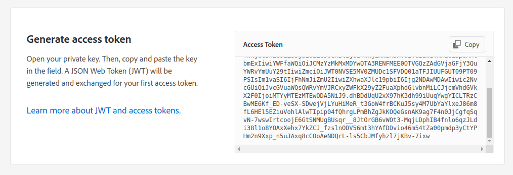 Generate access token์ ์์์ ๋ค์ด๋ก๋ ๋ฐ์ private.key(๊ฐ์ธํค)์ ํ์ผ ๋ด์ฉ์ ๋ณต์ฌํ์ฌ ๋ถ์ฌ๋ฃ๊ณ , Generate Token ๋ฒํผ์ ํด๋ฆญํด์ค๋๋ค.