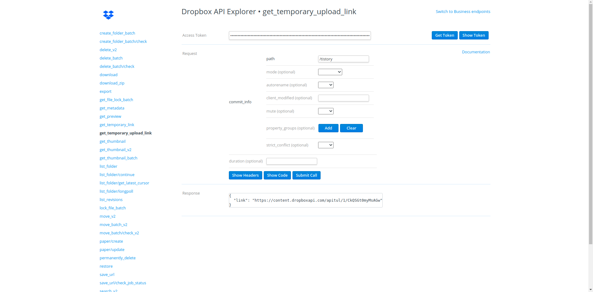 Dropbox์์๋ API Explorer๋ฅผ ์ ๊ณตํ์ฌ Dropbox์์ ์ ๊ณตํ๋ API๋ฅผ ๋ฐ๋ก ์ฌ์ฉํ ์ ์๋ ์น ์๋น์ค๋ฅผ ์ ๊ณตํฉ๋๋ค. ๋ฐ๋ผ์ ์ฐ๋ฆฌ๋ ์ด๋ฅผ ์ด์ฉํ์ฌ ํ์ผ์ ์ ๋ก๋ ํ ์ ์๋ ๋งํฌ๋ฅผ ๋ง๋๋ ๋ฐ ์์ฃผ ์ฝ๊ฒ ์ฌ์ฉํ ์ ์์ต๋๋ค.