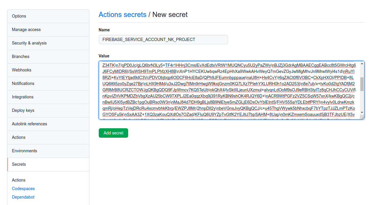 ์ด์ ํ๋ก์ ํธ ๋ ํฌ์งํฐ๋ฆฌ์์ Secrets์ ๋ค์ด๊ฐ ํ ์๊น ์์์ ์ง์ ํ Secret ์ด๋ฆ์ผ๋ก Secret์ ๋ง๋ ๋ค์ JSON์ผ๋ก ๋ฐ๊ธ ๋ฐ์ ํค๋ฅผ ๋ฃ์ด์ฃผ๊ณ Secret์ ์ถ๊ฐํ๋ฉด ๋ฉ๋๋ค.