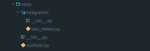 ํ ์คํธ ๋ชจ๋์ ๊ตฌ์กฐ๋ ์์ ๊ฐ์ต๋๋ค. test_memo.py์ ์ฐ๋ฆฌ๊ฐ ์ด์ ์ ์์ฑํ๋ Memo Application์ ๋ํ API ํ ์คํธ ์ฝ๋๋ฅผ ์์ฑํ ๊ฒ์ด๋ฉฐ conftest.py์๋ ์ฐ๋ฆฌ๊ฐ ์ฌ์ฉํ test fixture๋ฅผ ์์ฑํ ๊ฒ์ ๋๋ค.