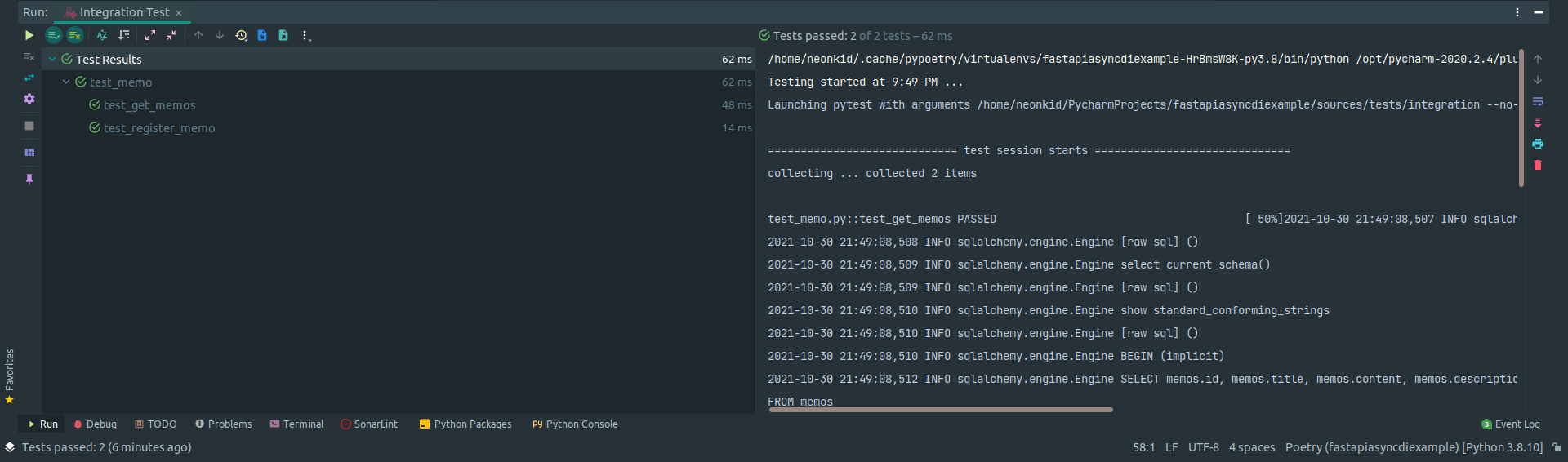 ๋ชจ๋ ํ ์คํธ ํจ์์ pytest.mark.asyncio ๋ฐ์ฝ๋ ์ดํฐ๋ฅผ ๋ถ์ฌ์ค ๋ค async await ๊ตฌ๋ถ์ ์ฌ์ฉํ๋๋ก ํฉ๋๋ค. SQLAlchemy์ ๊ฒฝ์ฐ DB์์ ๋ฐ์ดํฐ ์กฐํ์ AsyncSession์ ์ฌ์ฉํ๋ ๊ฒฝ์ฐ SQLAlchemy 2.x ๋ฌธ๋ฒ์ ์ฌ์ฉํฉ๋๋ค.
