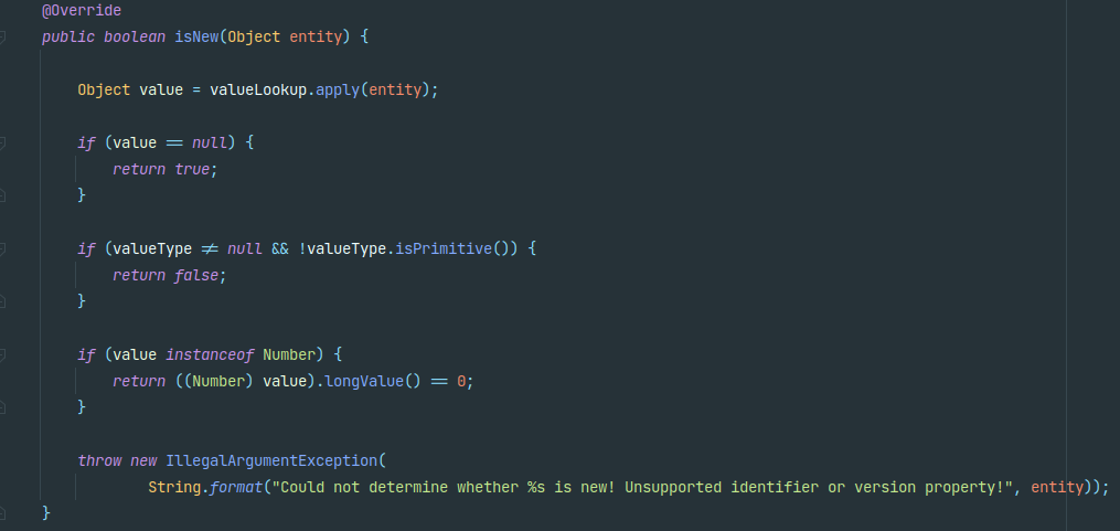 Spring Data์๋ IsNewStrategy๋ผ๋ ์ธํฐํ์ด์ค๊ฐ ์กด์ฌํ๋๋ฐ, ์ด ์ธํฐํ์ด์ค๋ ์ด Entity ๊ฐ์ฒด๊ฐ ์๋ก์ด ๊ฐ์ฒด์ธ์ง ์๋์ง๋ฅผ ๋ํ๋ด์ฃผ๋ ์ถ์ ๋ฉ์๋์ ๋๋ค. ์ด๋ฅผ ์์ ๊ณผ์ ์์ ์ฌ์ฉํ๋ ๊ตฌํ์ฒด๋ก PersistenceEntityIsNewStrategy ํด๋์ค๊ฐ ์๊ณ , ์ด ์ฝ๋๊ฐ ๋ฐ๋ก ์ฐ๋ฆฌ๊ฐ ์ฌ์ฉํ๋ isNew์ ํต์ฌ์ ๋๋ค.