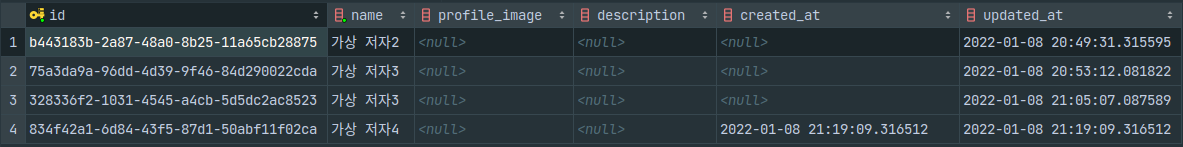 ๋ฐ์ดํฐ๋ฅผ ์ฝ์ ํ๊ณ ๋๋ฉด ์ด๋ ๊ฒ created_at์๋ Auditing์ด ์ ์ฉ๋๋ ๊ฒ์ ๋ณผ ์ ์์ต๋๋ค.