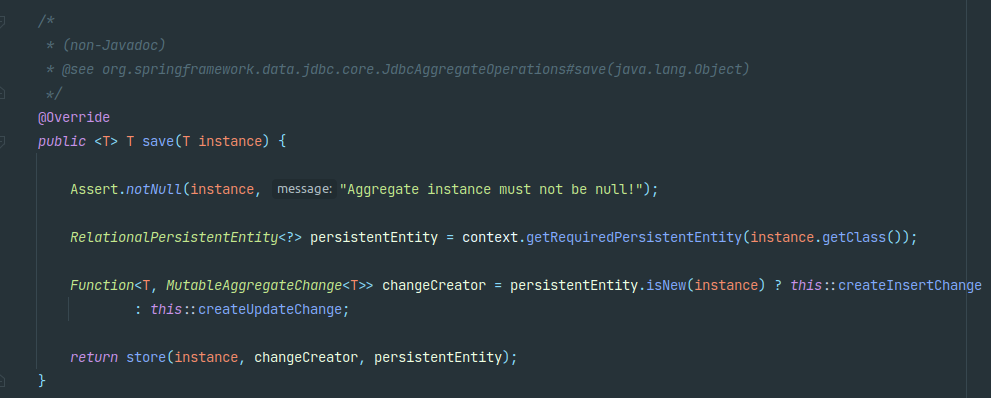 ์ ์ฝ๋๋ JDBC์ CrudRepository์ ๋ด์ฅ ๋ฉ์๋ ์ค save ๋ฉ์๋๊ฐ ๋์ํ๋ ์ฝ๋์ ๋๋ค. JDBC์ CrudRepository๋ JdbcAggregateTemplate ํด๋์ค์ ๋ฉ์๋๋ฅผ ์ฌ์ฉํ๋ฉฐ save ๋ฉ์๋๋ Entity์ isNew ๋ฉ์๋์ ๋ฐ๋ผ INSERT ์ฟผ๋ฆฌ๋ฅผ ์ฌ์ฉํ ์ง, UPDATE ์ฟผ๋ฆฌ๋ฅผ ์ฌ์ฉํ ์ง๋ฅผ ์ ํํ๋ ๋ชจ์ต์ ๋ณผ ์ ์์ต๋๋ค.