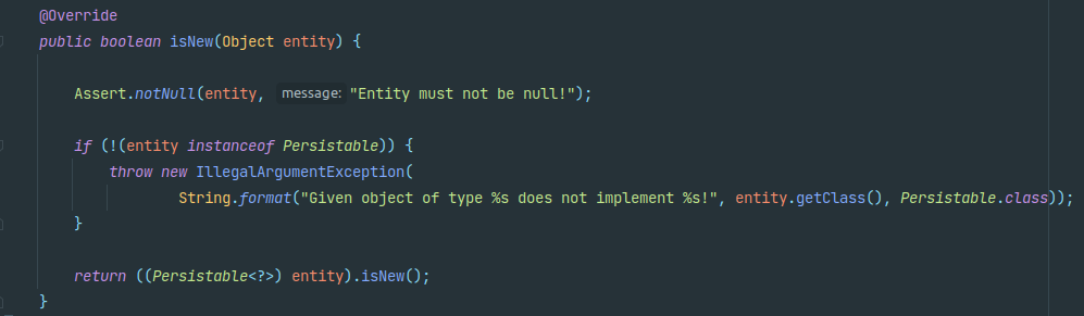PersistableIsNewStrategy๋ ์ฃผ์ด์ง entity ์ธ์คํด์ค๊ฐ Persistable ์ธ์คํด์ค์ธ์ง ๊ฒ์ฌํ ํ, ๊ตฌํ๋ isNew ๋ฉ์๋๋ฅผ ํตํด ์๋ก์ด ๋ฐ์ดํฐ์ธ์ง ์๋์ง๋ฅผ ๊ตฌ๋ถํฉ๋๋ค.