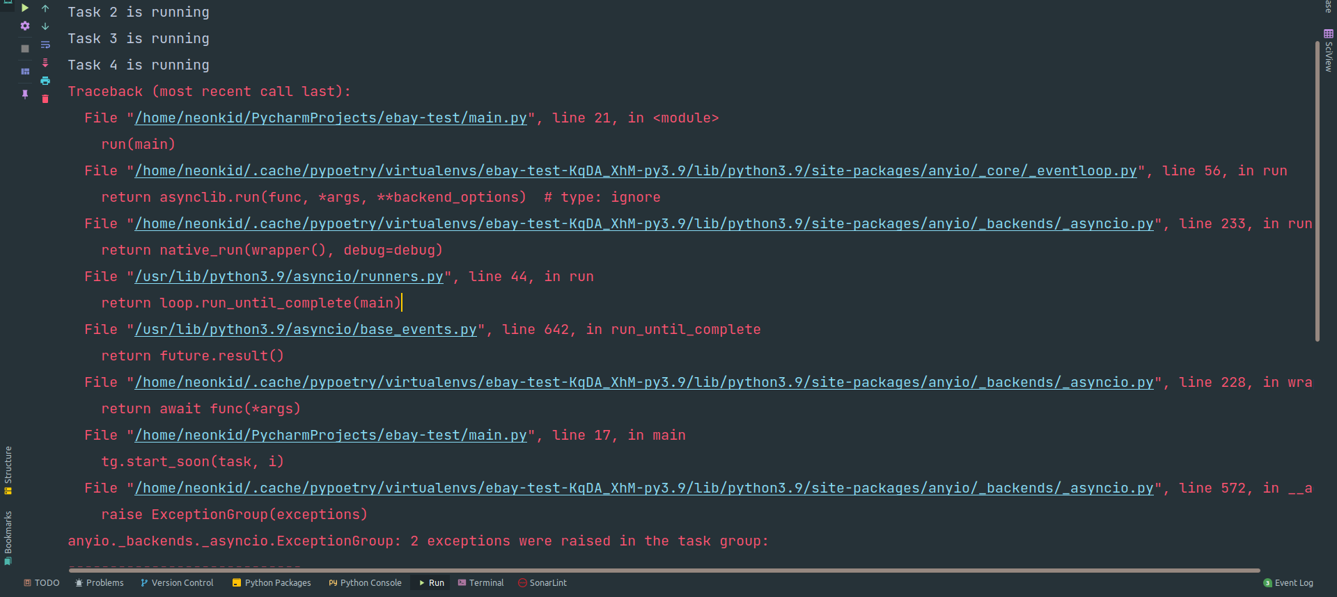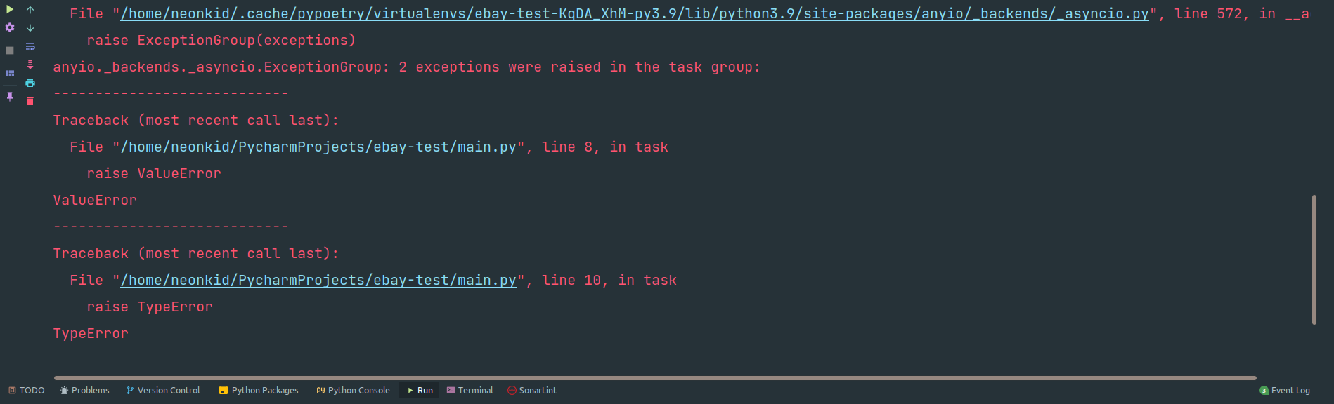 anyio๋ ๋ฐ๋ก ์์ task_group๊ณผ ๋น์ทํ ExceptionGroup์ ์ฌ์ฉํฉ๋๋ค.