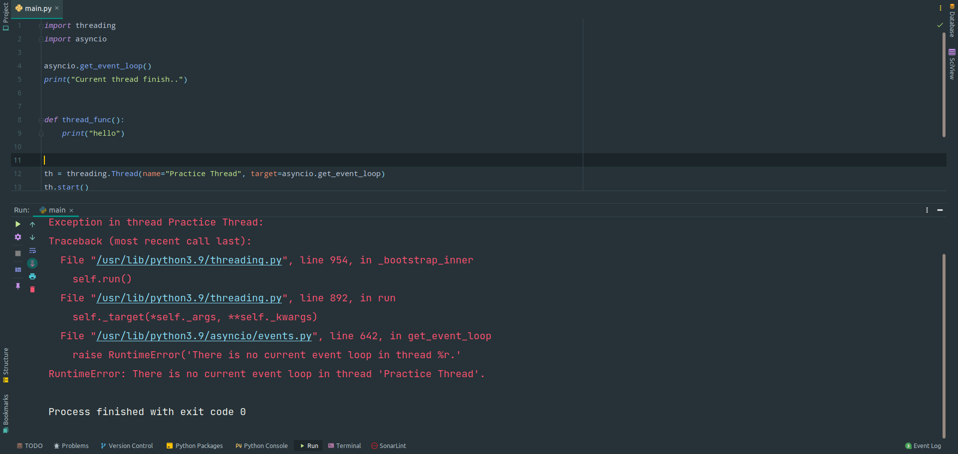 ํ์ง๋ง Python์ asyncio๋ ์ด์ ๊ฐ์ด ๋์ํ์ง ์์ต๋๋ค. ๋ฉ์ธ ์ค๋ ๋์์ get_event_loop ํจ์๋ฅผ ์ด์ฉํด ์ด๋ฒคํธ ๋ฃจํ๋ฅผ ์์ฑํ ์ ์๋๋ฐ, ์ด๋ฅผ ๋ค๋ฅธ ์๋ธ ์ค๋ ๋๋ฅผ ๋ง๋ค๊ณ ์์ฑํ๋ฉด ์ค๋ฅ๊ฐ ๋ฐ์ํฉ๋๋ค.