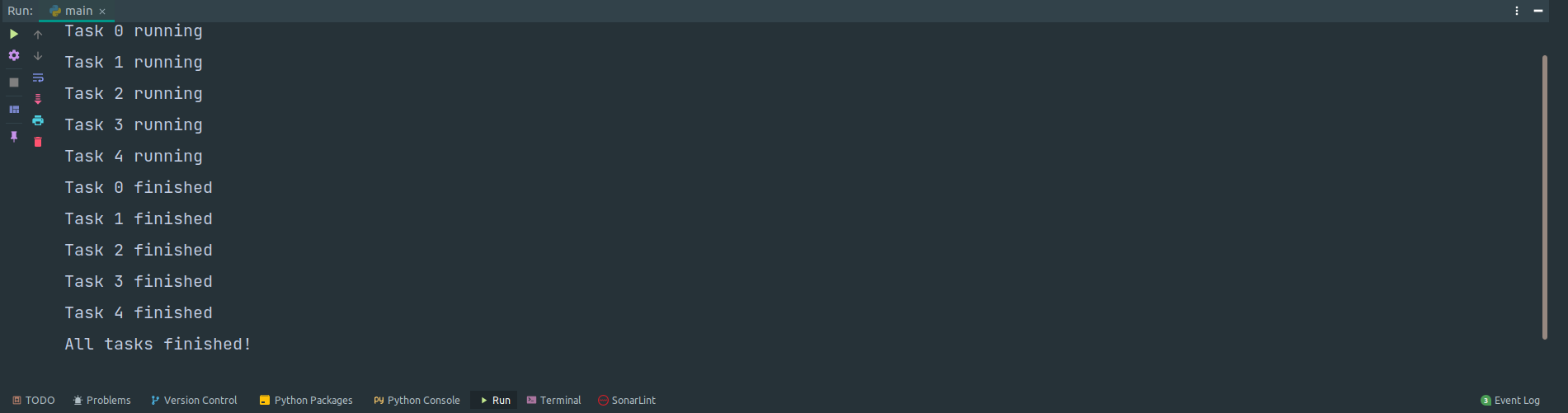 ๊ทธ๋ฌ๋ฉด ์์ฐจ์ ์ผ๋ก Task 0 ~ 5 running์ด ์คํ๋์๋ค๊ฐ 1์ด ๋ค finished๊ฐ ๋ํ๋๋ ๊ฒ์ ๋ณผ ์ ์์ต๋๋ค.