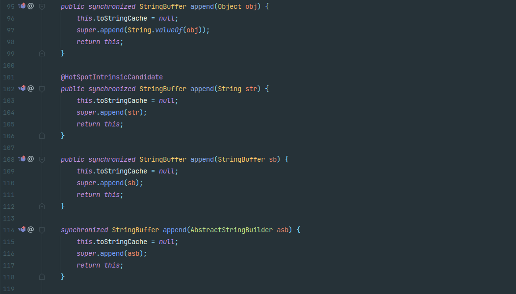 ๊ทธ๋ผ์๋ ๋ถ๊ตฌํ๊ณ , ๋ ํด๋์ค์๋ ์ฐจ์ด๊ฐ ์๋๋ฐ, ๋ฐ๋ก syncronization์ ์ ์ฉ ์ ๋ฌด์ ๋๋ค. StringBuffer์๋ ๋ฐํ ๋ฉ์๋์ syncronized๊ฐ ์ ์ฉ๋์ด ์์ง๋ง StringBuilder์๋ ์ ์ฉ๋์ด ์์ง ์์ต๋๋ค.