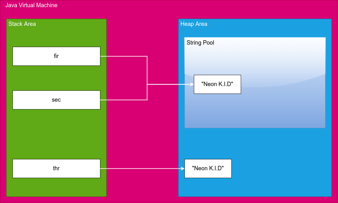 ๋ฐ๋ผ์ fir ๋ณ์์ sec ๋ณ์๋ String Pool์์ ๊ฐ์ Heap ์์ญ์ ์ฐธ์กฐํ๊ณ ์๊ธฐ ๋๋ฌธ์ "==" ์ฐ์ฐ์๋ฅผ ํตํด์๋ true๊ฐ ๋์ค๋ ๊ฒ์ ๋๋ค.