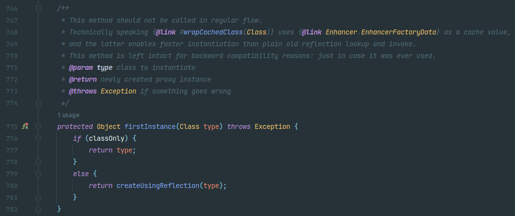 ์ค์ ๋ก ์ฝ๋๋ฅผ ๋ณด๋ฉด classOnly ํ๋๊ทธ๊ฐ ์ฃผ์ด์ง ๊ฒฝ์ฐ๋ ๋จ์ํ ํด๋์ค ํ์๋ง์ ๋ฐํํ๊ณ , ๊ทธ๋ ์ง ์์ ๊ฒฝ์ฐ๋ Reflection์ ์ด์ฉํด ํด๋์ค๋ฅผ ๋ถ์ํ๊ณ ๊ฐ์ฒด๋ฅผ ๋ง๋ค์ด ๋ฐํํ๋ ๋ชจ์ต์ ๋ณผ ์ ์์ต๋๋ค.