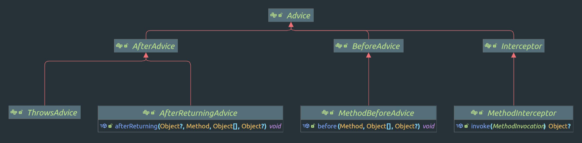 ์ ์ด๋ฏธ์ง๋ Spring Advice์ ๊ณ์ธต ๊ตฌ์กฐ๋ฅผ ๋ํ๋ธ ๊ฒ์ ๋๋ค. Spring Advice์ ๊ณ์ธต ๊ตฌ์กฐ๋ ํ์ค AOP ์ผ๋ผ์ด์ธ์ค ์ธํฐํ์ด์ค์ ๋์ผํ ๊ตฌ์กฐ๋ก ๋์ด ์์ผ๋ฉฐ ProxyFactory ํด๋์ค๋ฅผ ์์ ํ์ง ์๋๋ผ๋ ์๋ก์ด ์ด๋๋ฐ์ด์ค ํ์ ์ ์ฝ๊ฒ ๋ง๋ค ์ ์๋ ๊ตฌ์กฐ๋ก ๋์ด ์์ต๋๋ค.