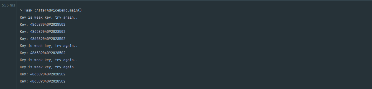 ๋ณด๋ค์ํผ 1์ด ๋์์ ๋๋ ๋ณด์์ ์ทจ์ฝํ ํค๋ฅผ ์ถ๋ ฅํ๋ SecurityException์ ๋ฐ์ํ๊ณ , ๊ทธ๋ ์ง ์์ ๊ฒฝ์ฐ STRONG_KEY๊ฐ ์ ์ถ๋ ฅ๋๋ ๊ฒ์ ๋ณผ ์ ์์ต๋๋ค.