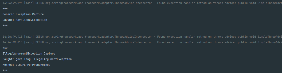 ์ฒซ ๋ฒ์งธ afterThrowing ๋ฉ์๋๋ฅผ ๋ณด๋ฉด Java์ ๋ชจ๋ Exception ํ์ ์ ์ธ์๋ก ์ง์ ํ๋๋ฐ, ์ด๊ฒ์ ๋ชจ๋ ์์ธ ์ผ์ด์ค์ ํด๋น ๋ฉ์๋๋ฅผ ์ ์ฉํ๊ฒ ๋ค๋ ๊ฒ์ ๋๋ค. ์ด ๋ฉ์๋์ ๊ฐ์ฅ ํฐ ์ฐ์ ์์๋ ์์ธ ํ์ ์ ์ธ์๋ก ๋ฐ๋ afterThrowing ๋ฉ์๋๊ฐ ์์ ๋ ๋์ํฉ๋๋ค.
