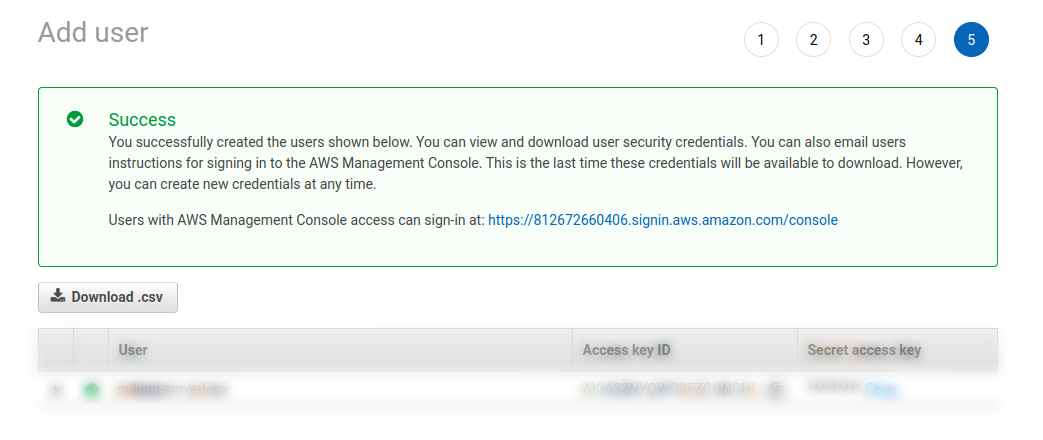 ์ ์ ์์ฑ์ด ์๋ฃ๋๋ฉด Access Key ID์ Secret Access Key๊ฐ ๋ถ์ฌ๋ฉ๋๋ค. ํ ๋ฒ ์์ฑ๋ Secret access key๋ ์ฝ์์์ ๋ ๋ฒ ๋ค์ ๋ณผ ์ ์์ผ๋ฏ๋ก .csv ํ์ผ์ ๋ค์ด๋ก๋ ๋ฐ์ ๋ณ๋๋ก ์ ์ฅํด๋์ผ์๋ ๊ฑธ ์ถ์ฒํฉ๋๋ค.